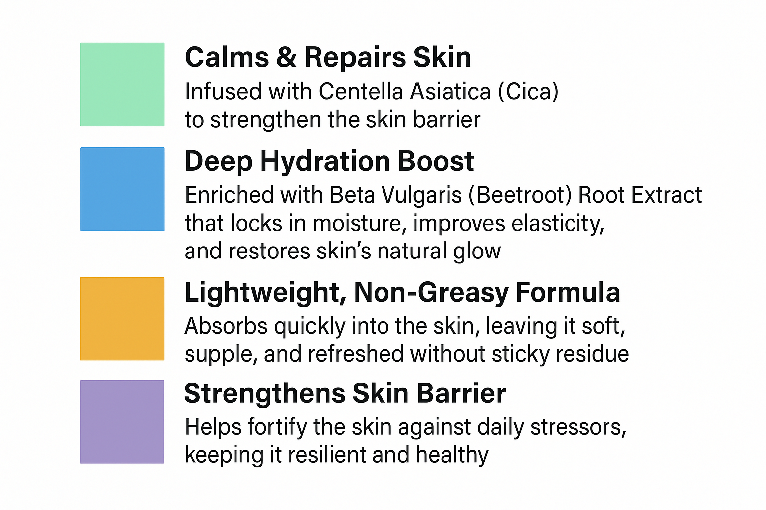 The TYC Cica Body Moisturiser is a soothing, hydrating formula crafted to calm, repair, and deeply nourish the skin. Powered by Centella Asiatica Extract (Cica), it helps to strengthen the skin barrier, works like an anti-oxidant and reduces oxidative stress. Enriched with Beta Vulgaris (Beetroot) Root Extract, it provides lasting hydration, boosts skin elasticity, and restores a natural, healthy glow.