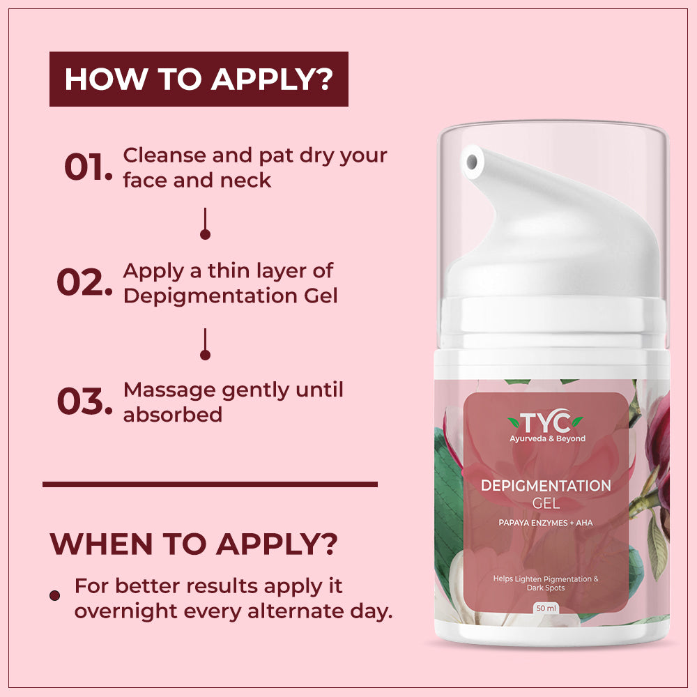 Direction to Use: Apply a thin layer of TYC depigmentation Gel to a clean and dry skin. Massage gently until absorbed. Apply alternate days overnight.