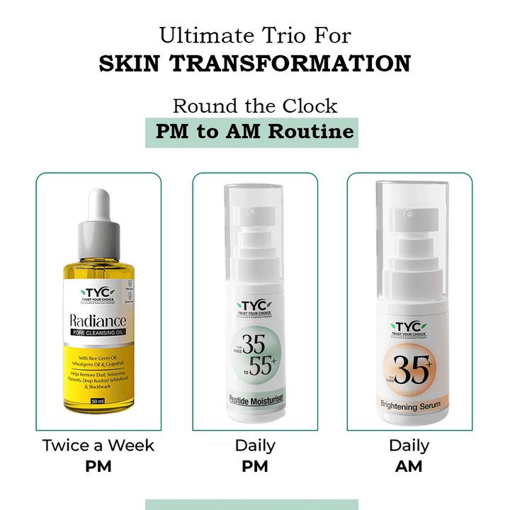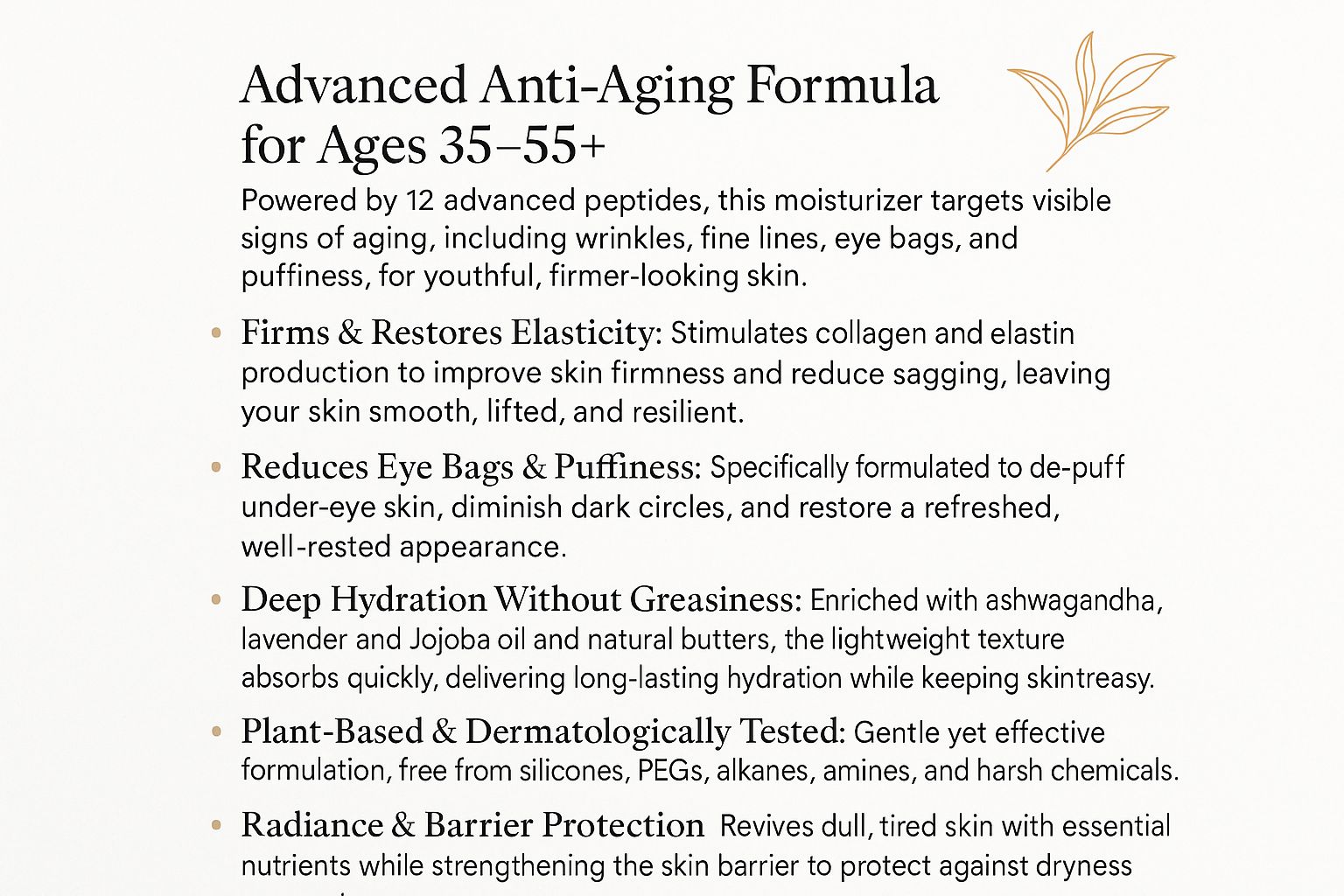 Rejuvenate your skin overnight with TYC Peptide Moisturizer, a potent blend of 12 advanced peptides designed to firm, repair, and deeply nourish mature skin. Tailored for ages 35-55+, this luxurious night cream enhances collagen production, reduces fine lines, improves skin elasticity, and restores hydration, ensuring you wake up with visibly smoother, firmer, and more radiant skin. The plant-based formulation absorbs quickly without greasiness. The formula is gentle yet effective, making it suitable for all skin types, including sensitive skin.