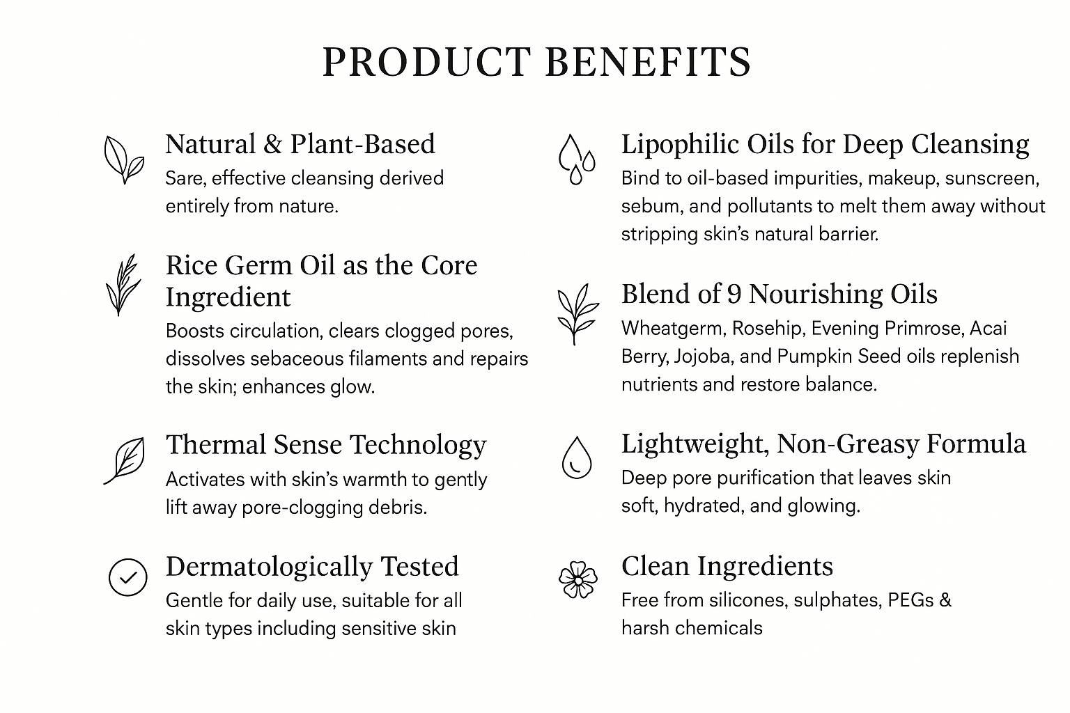 Lipophilic Oils for Deep Cleansing – Bind to oil-based impurities, makeup, sunscreen, sebum, and pollutants to melt them away without stripping skin’s natural barrier.