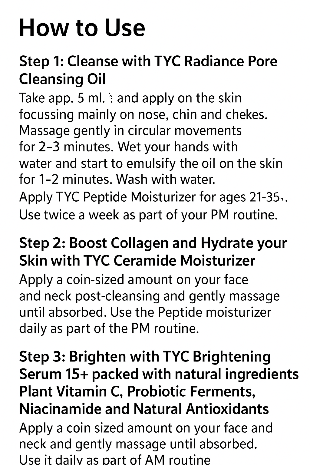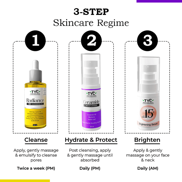 - TYC Brightening Serum 15+ (30ml) is formulated keeping in mind your tender skin. Formulated with Plant Vitamin C (Acerola Cherry), Niacinamide, Probiotic Ferments and botanical antioxidants to brighten & even skin, reduce high sebum activity, reduce dullness, fade tanning, thereby leaving your skin bright & glowing, deeply hydrated and even-toned.