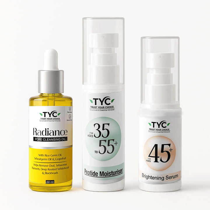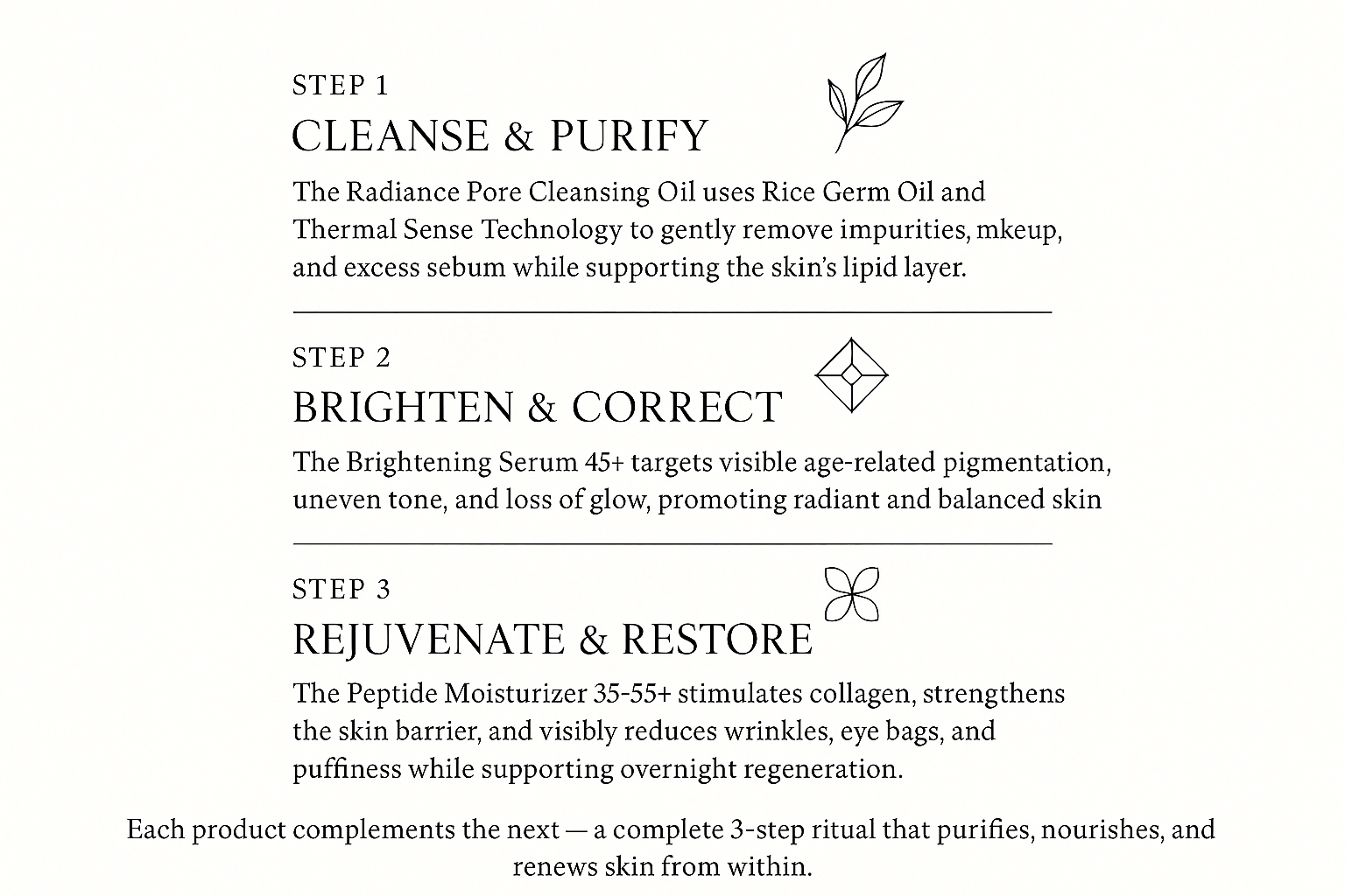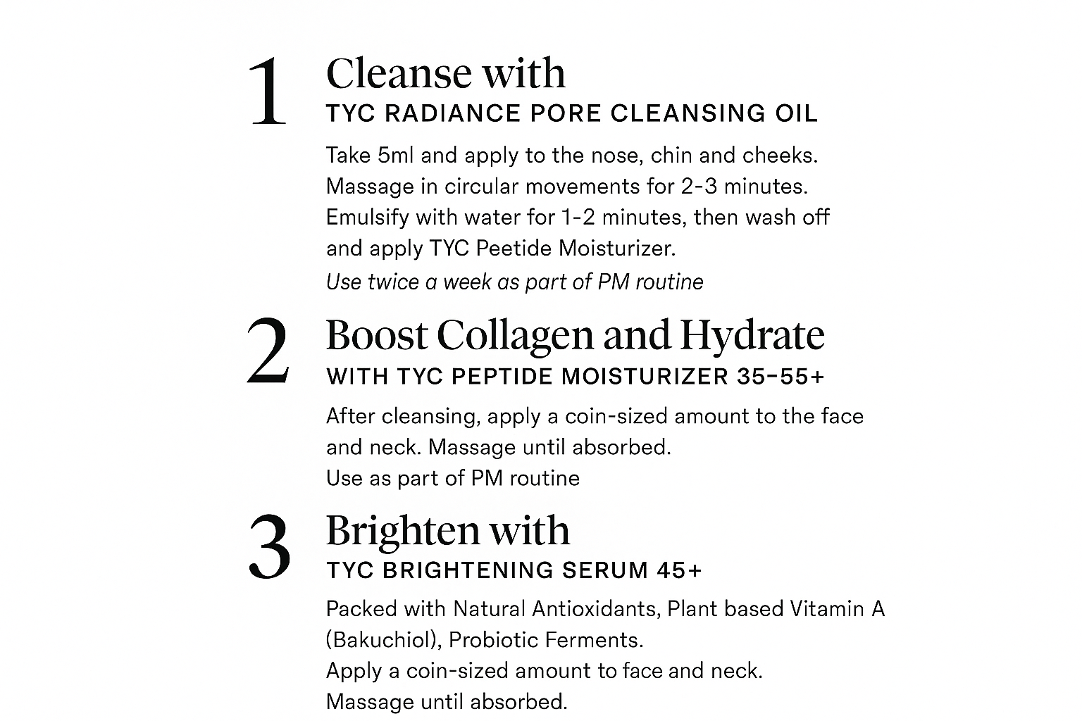 Reveal radiant, age-resilient skin with the TYC Advanced Trio Set — a complete 3-step skincare ritual crafted for ages 45+. This synergistic trio combines deep cleansing, brightening correction, and peptide-powered rejuvenation, giving your skin everything it needs to stay firm, hydrated, and luminous.